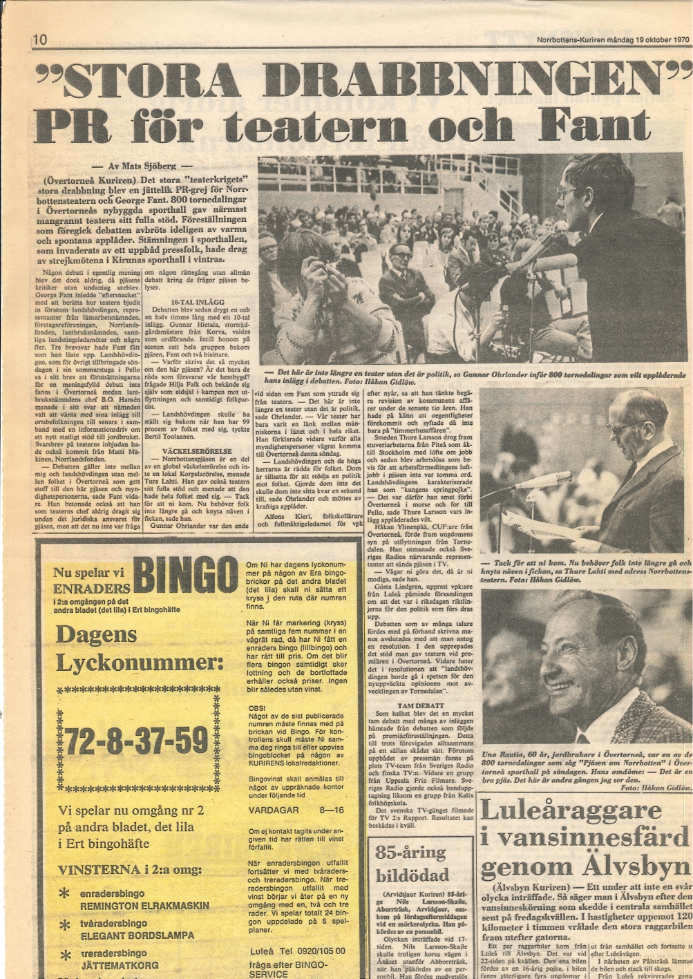 "'Stora drabbningen'. PR för teatern och Fant"', Mats Sjöberg. Norrbottens-Kuriren, 19/9-1970. Angående det stora "teaterkriget". Bild av Gunnar Ohrlander när han talar, citat: "Det är inte längre en teater utan det är politik, sa Gunnar Ohrlander inför 800 tornedalingar som vilt applåderade hans inlägg i debatten". Klippet är från Gunnar Ohrlanders arkiv, ARAB.