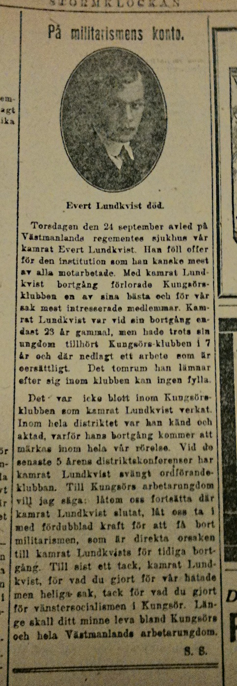 Evert Lundkvist hade varit en av Kungsörsklubbens aktivaste medlemmar och han hade hållit i klubban vid flera av Sörmland-Västmanlands ungdomsdistriktets årskonferenser. Han hade bekämpat militarismen men blev nu själv dess offer. Det var så man kände det bland hans kamrater. I minnesrunan i ungdomsförbundets tidning Stormklockan skrev en kamrat:
