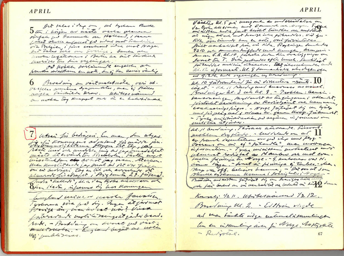 Väcktes kl. 5 på morgonen av underrättelser om den tyska aktionen mot Danmark och Norge. Tyske ministern hade just besökt Günther och meddelat att någon attack mot Sverige inte förbereddes. Vid sjutiden överlämnade han en note, vari förväntades strikt neutralitet från vår sida. Regeringen samlades ½ 10 och sammanträffade med Kungen, kronprinsen och G.A. kl. 10, fortsatte sedan sina överläggningar om svaret till T. Detta justerades efter lunch. Samtidigt förbereddes militära inkallelser. Utrikesnämnden hade kl. 12 informerats. Kl. 8 sammanträdde riksdagen och vid 9:tiden hade regeringen ny beredning.10 april